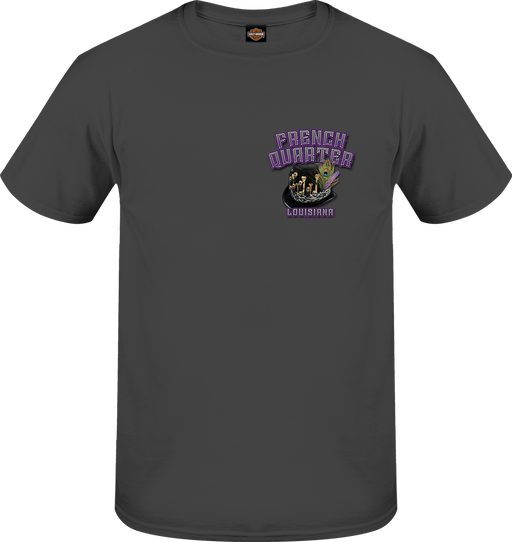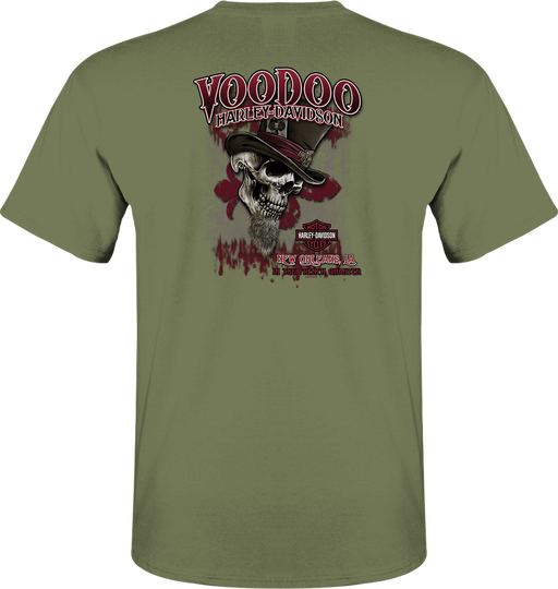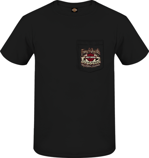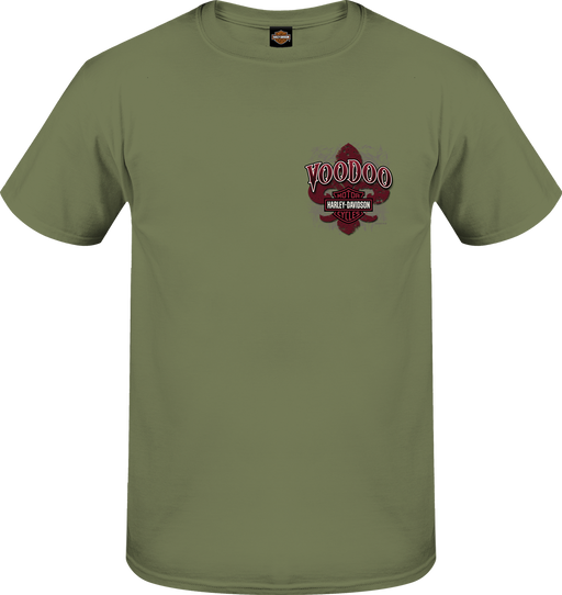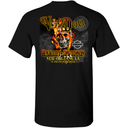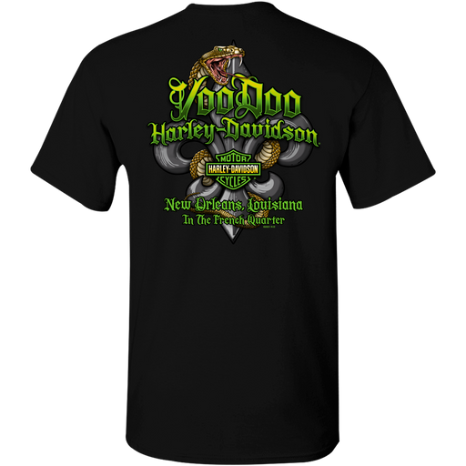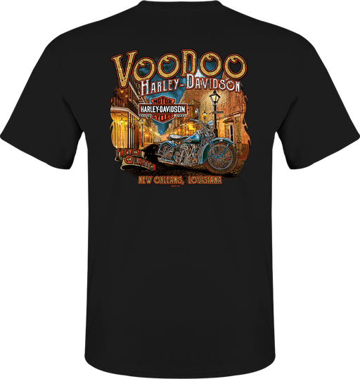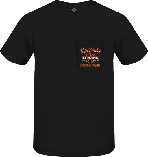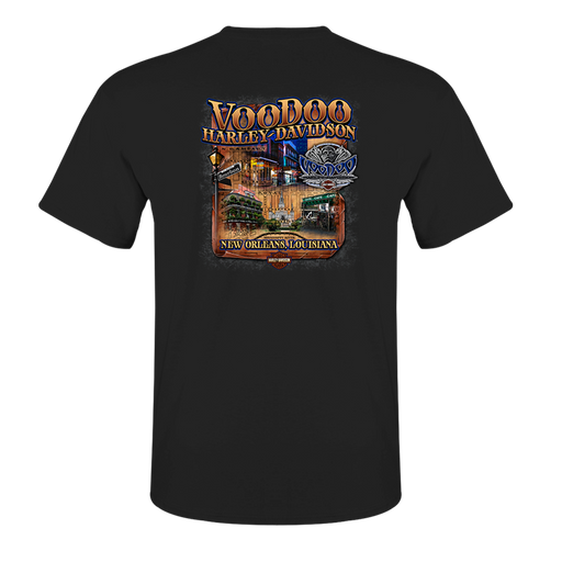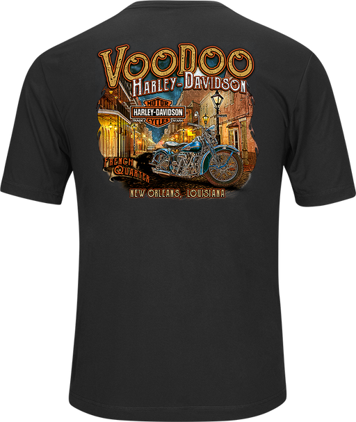 Voodoo Harley-Davidson Men's Short Sleeve T-Shirt with Pocket with Decatur Street Design. 100% Cotton.