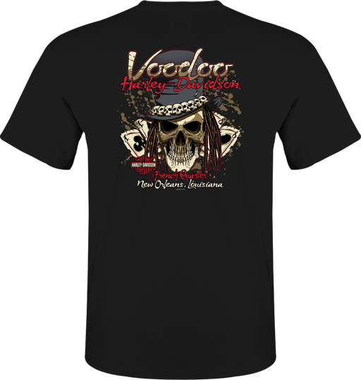 Voodoo Harley-Davidson Men's Short Sleeve T-Shirt with Dead Man's Hand design. 100% Cotton.